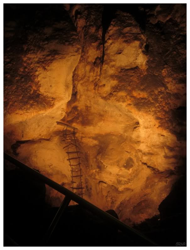 Walking along, I noticed an old wooden ladder remaining in its place. This ladder led early explorers down to the Lower Cave, which you could see with a few more minutes of walking (there was an overlook with green lights showcasing said cave).