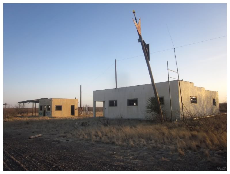 I wasn't racing towards Orla, but when I happened upon the intersection, I couldn't pass up the chance meeting. Orla is a ghost town which used to have more than 200 people, but is now home to a population of 2. There were a lot of trucks sitting around with their engines running, presumably ready to take off for the oil rigs which surround the hamlet.