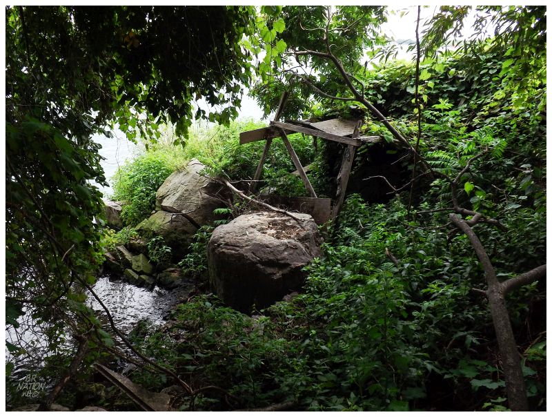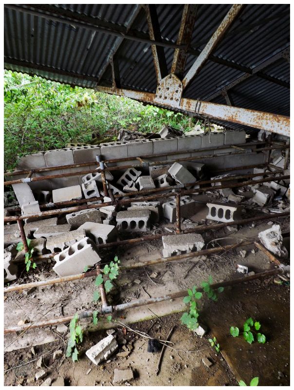 As Donnie wanted to take some film pictures with his tripod of the dumped boat, I was left to my own & wandered into a small structure by the shore. The front of this building was entirely missing, where I could sit on some of the cinderblocks and look out over the backside cove. Everything was calm without flies, wind or direct sun. I could have sat there and eventually laid there for hours.