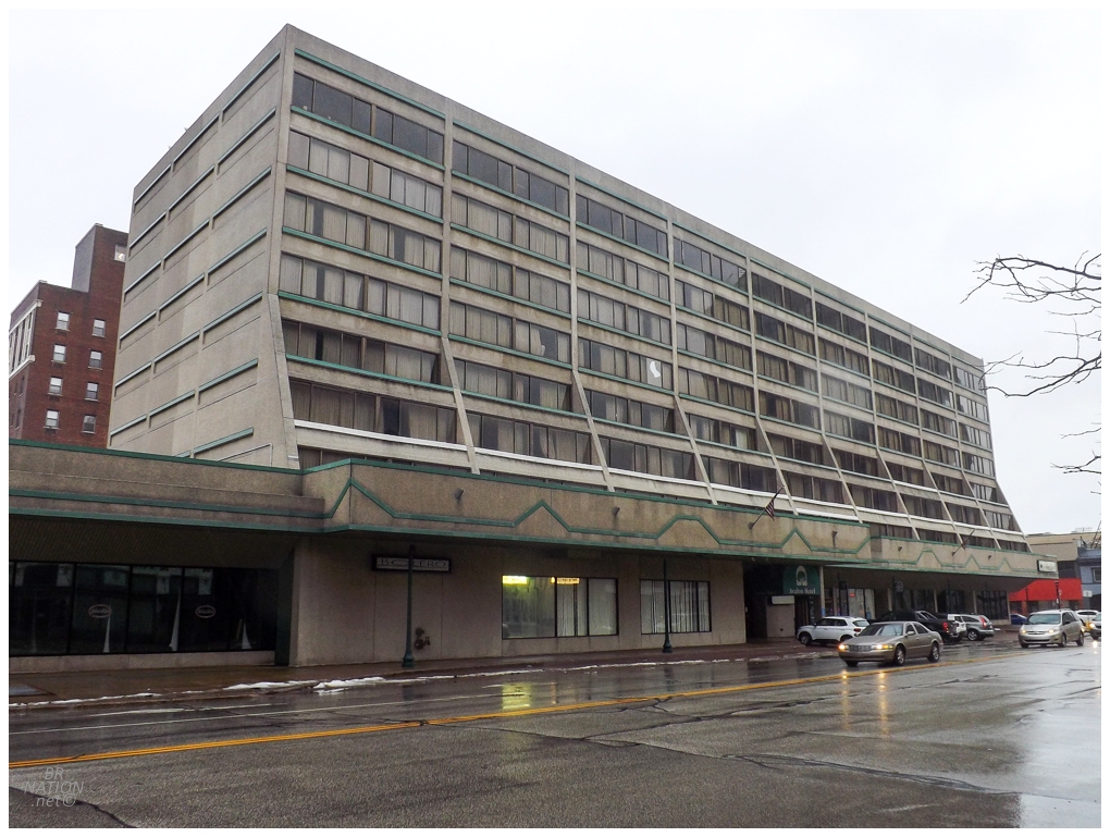 The sunny day had turned to snow and bleakness as I curved around Cleveland, then followed the coast up to the biggest Pennsylvanian town on Lake Erie. My room was at the Avalon Hotel, a place hanging on that opened as the Hilton in 1977. The lobby was dark and dated and had the decor of a rundown casino or strip club (mirrors, carpet, ancient light fixtures).
