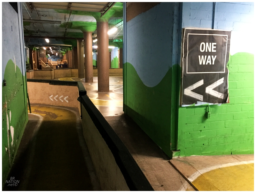 After passing the store and cafe near the entrance, I entered the biggest room where there was the aforementioned rhythm section, plus a whole section with logs and elevated wood for mountain bikers to hop on and jammed their brakes riding skinny things. It was fun to randomly cruise through and hop things and ride some of the skinny stuff, but it was also clearly made for mountain bikes or dirt jumping BMXers.