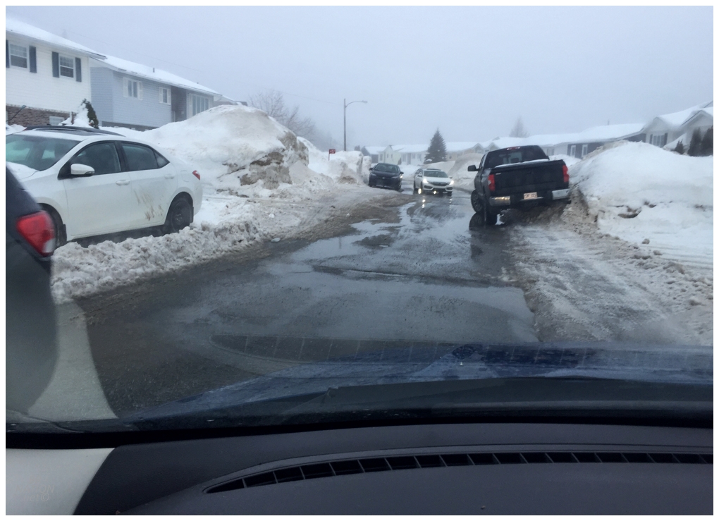 Up at higher elevations, this meant a fun obstacle course of narrowed roads, cars in the road to allow driveway shovelling, plus ruts and ice trying to shoot you every which way. |