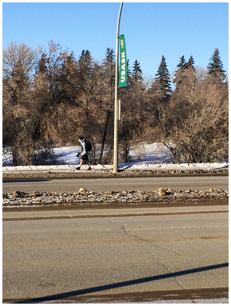 It wasn't as brutally cold as last night, so of course a Shorts Guy was out. After all, today's high was -14°C/9°F. |