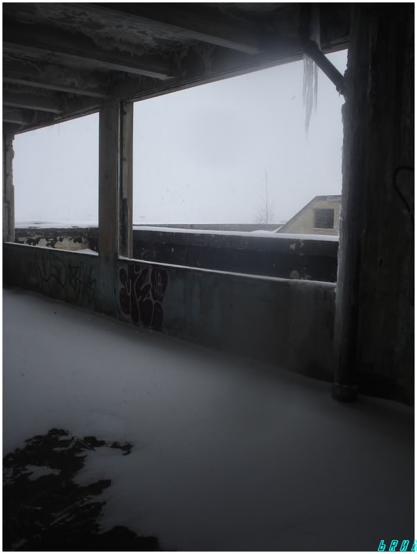 Thankfully though, the storm provided enough cover to walk around the building and look for entrances. I found none outside a small fence; until I came back around to the front of the building...that's where I spotted a 3 foot by 2 foot window frame open to the elements. I looked around and only saw a bus far off in the distance - I saw this as good as opportunity as any and quickly made my way into the window.