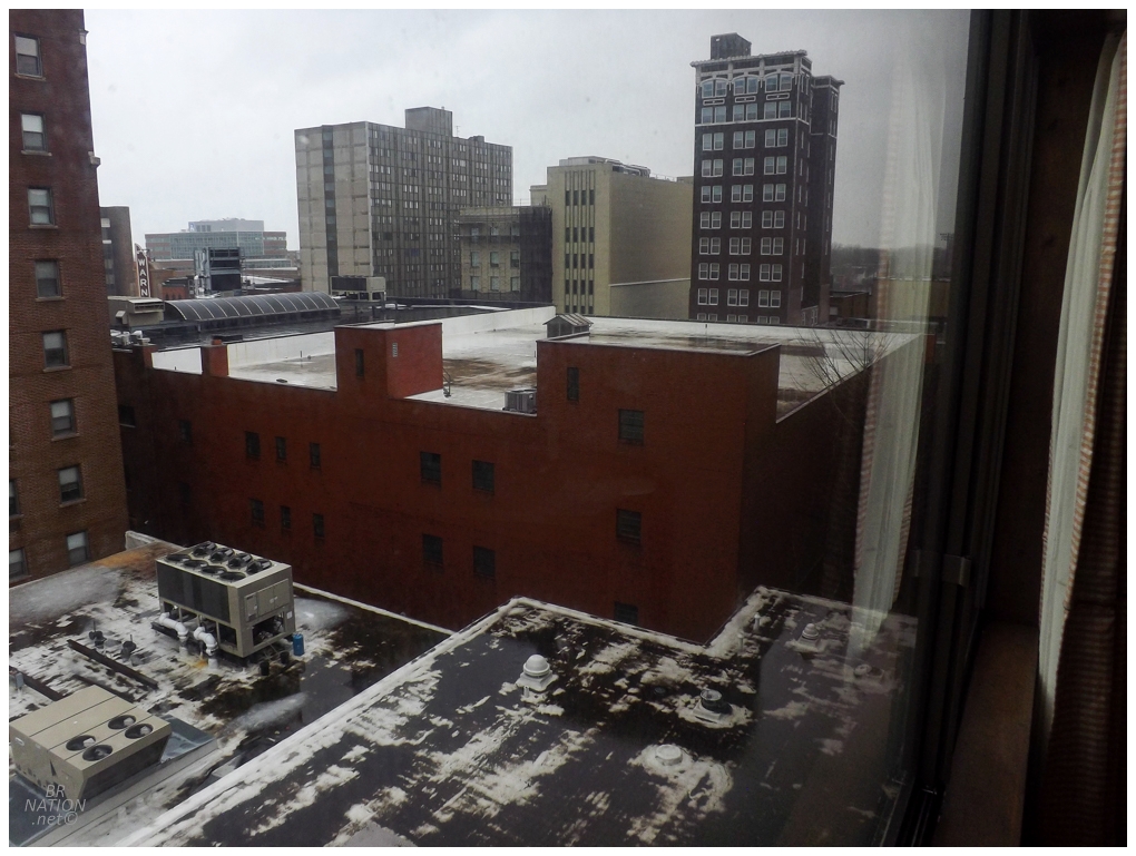 The sunny day had turned to snow and bleakness as I curved around Cleveland, then followed the coast up to the biggest Pennsylvanian town on Lake Erie. My room was at the Avalon Hotel, a place hanging on that opened as the Hilton in 1977. The lobby was dark and dated and had the decor of a rundown casino or strip club (mirrors, carpet, ancient light fixtures).