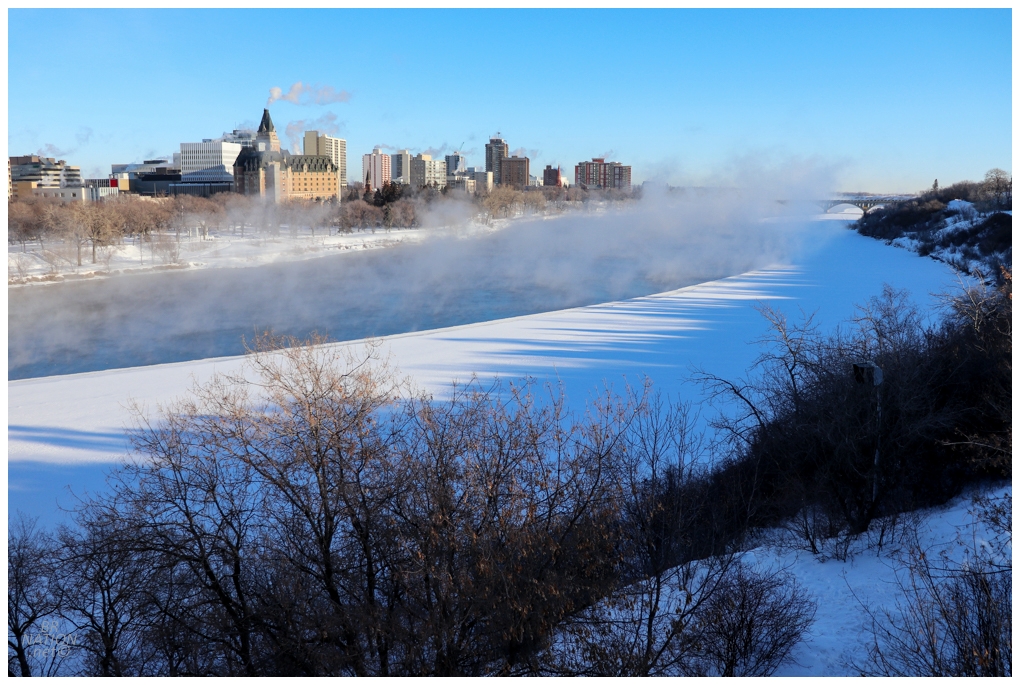 I had one last order of business in Saskatoon as I could see the steam coming off the South Saskatchewan River from my accommodations and I needed to pop down into the riverside park for a picture. |