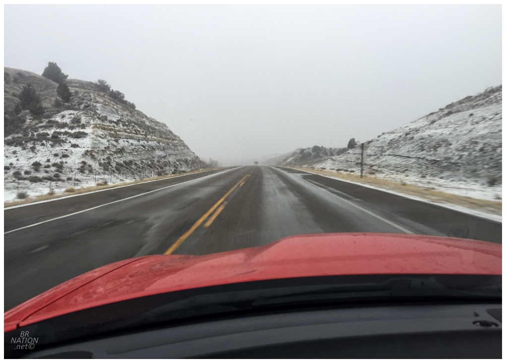 Coming up out of the Yellowstone River Valley, the road conditions still weren't great so I took it slow and let people pass. There was a moment where I thought maybe I was being overly cautious, until a minute later I saw a car up on an embankment, trailed by skidding tire tracks in the snow and a destroyed highway sign. I slowed it down even further.